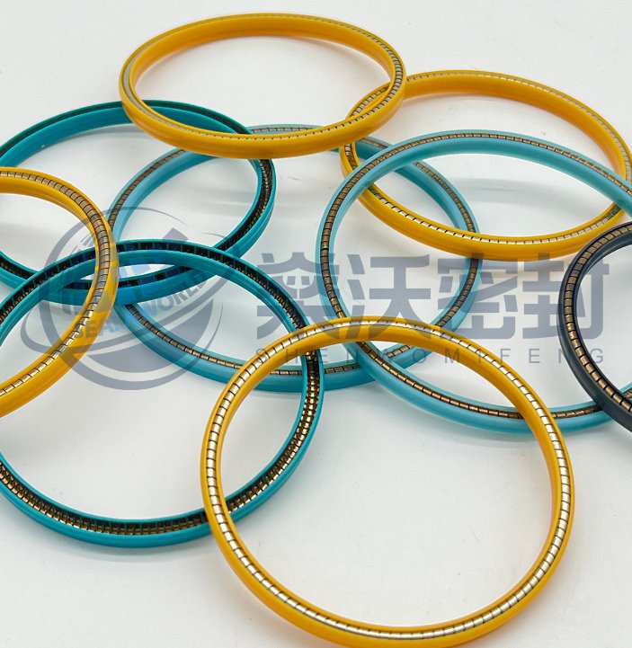 孔轴蓄能圈,是由高功能聚合材料密封壳和耐腐蚀的不锈钢金属弹簧组成。密封圈安装在沟槽内,弹簧受压,形成向外的张力,促使密封唇紧贴密封沟槽,由于弹簧给密封唇提供弹力,能弥补密封壳磨损和配合零件的偏心,由此形成从真空到低压范围内的密封。另外系统压力会辅助弹簧蓄能,压力越大,密封唇与沟槽贴合的越充分,由此形成高压密封。